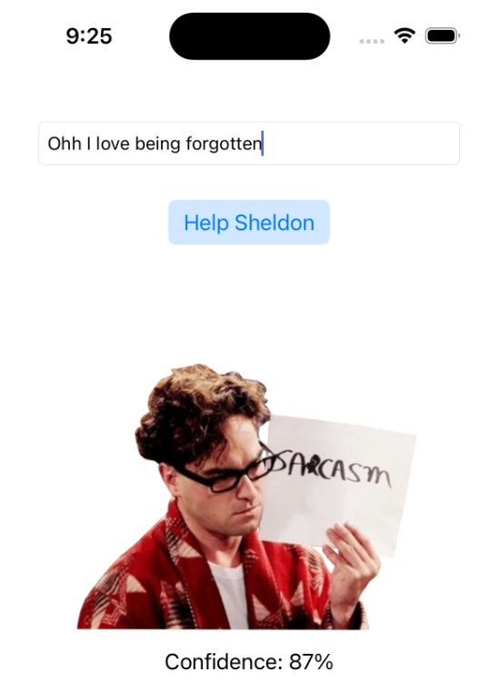 // Using HelpSheldonWithSarcasm - make sure you have the .mlmodel file in your project