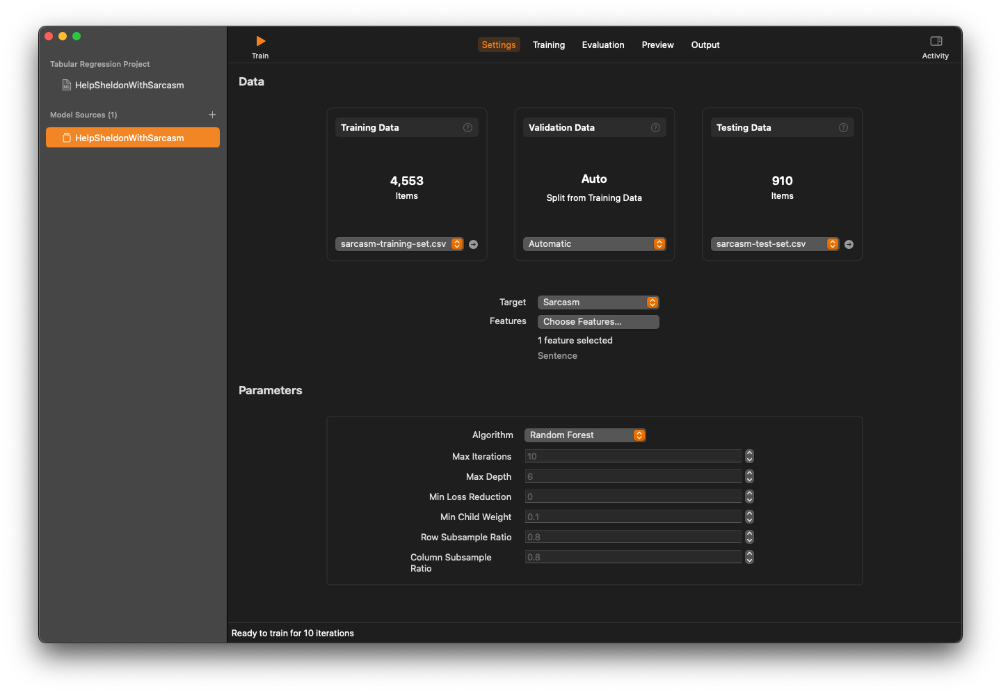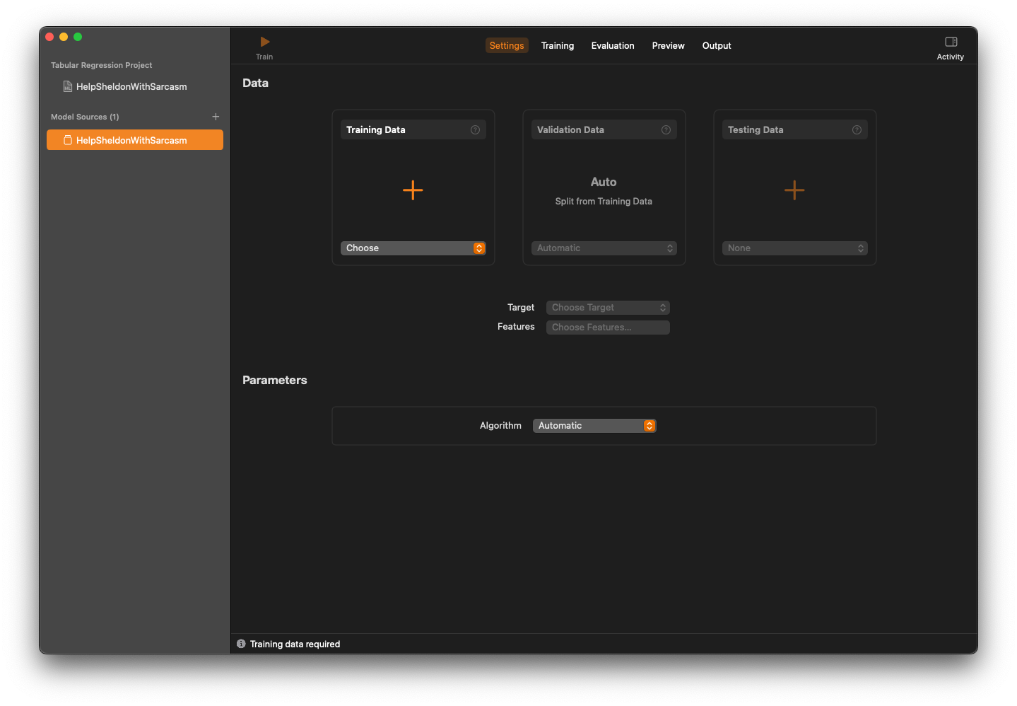 In this Create ML example, we will make training data and train a model. Create ML allows you to train models directly in Swift. This example of training a text classifier to help Sheldon to detect sarcasm 😃 .